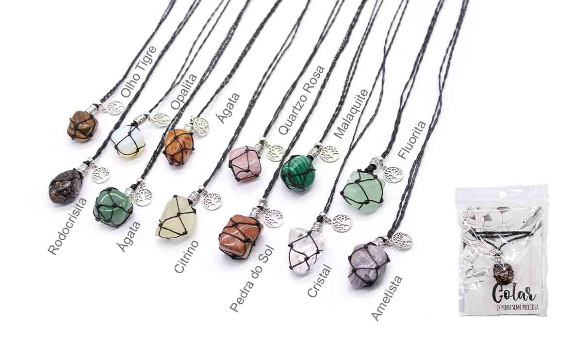 Olho Tigre, Opalita, Ágata, Quartzo Rosa, Malaquite, Fluorita, Citrino, Roda Crisita, Pedra do Sol, Cristal, Ametista, Ágata Verde