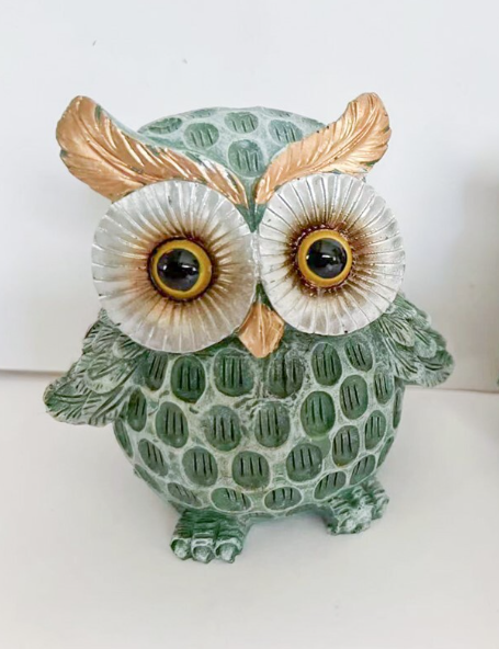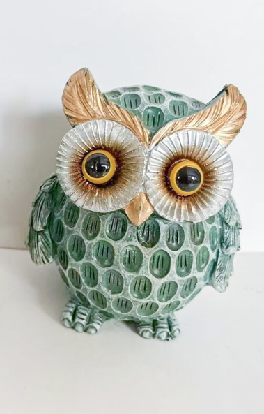 Design de mocho verde com detalhes dourados nas orelhas e olhos.
