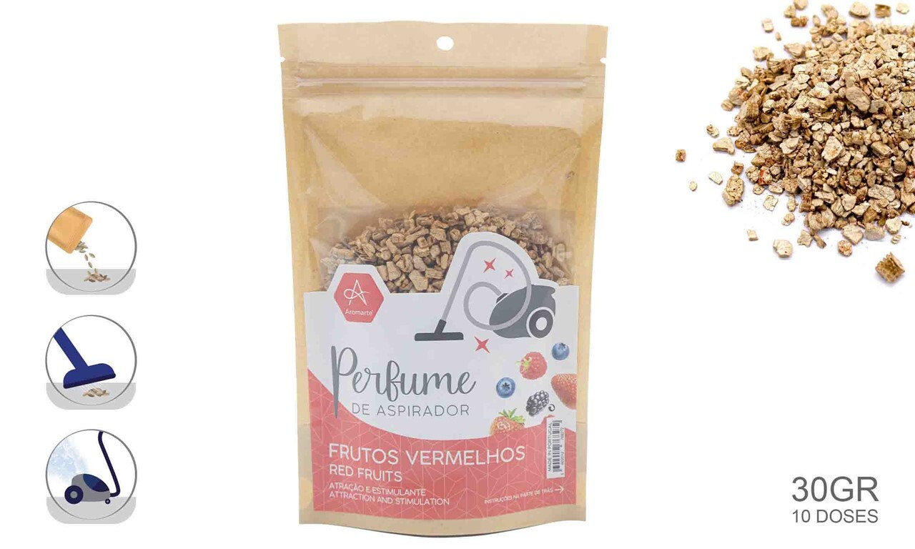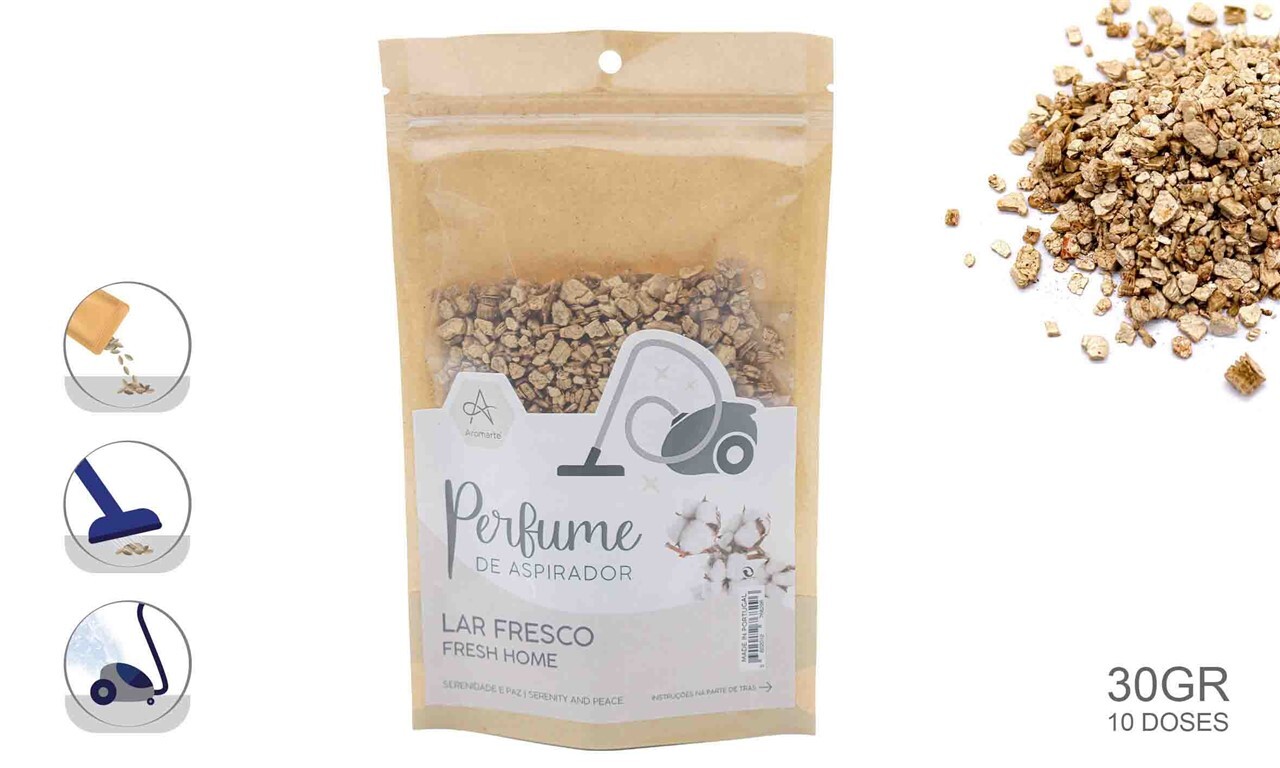 Pós e Grânulos Perfumados: São a opção mais comum. Basta espalhar uma pequena quantidade (cerca de uma colher de sopa) no chão e aspirá-la. O produto entra no aspirador e liberta a fragrância através do fluxo de ar, perfumando a casa.