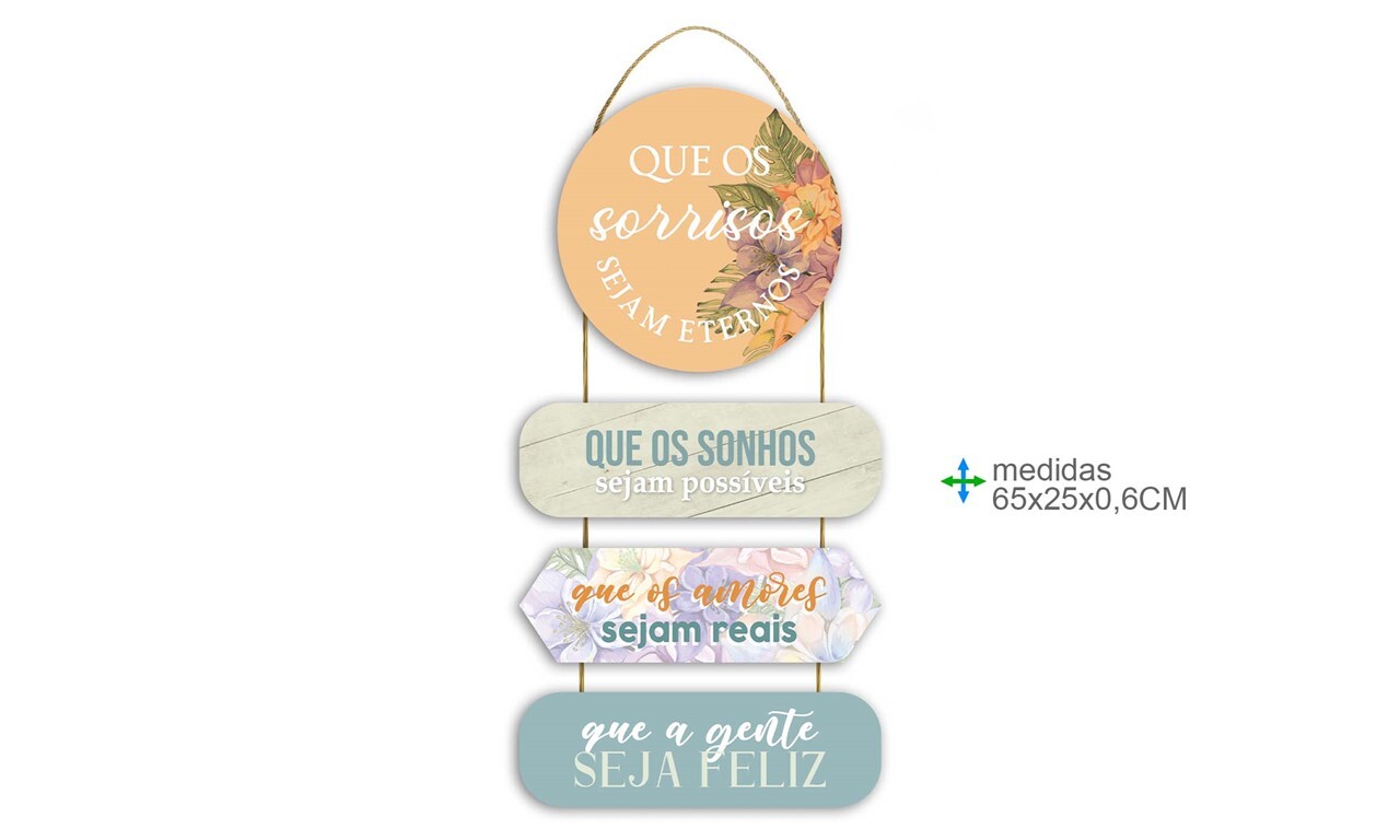 Placa de Parede com Frase: “Que os sorrisos sejam eternos. Que os sonhos sejam possíveis. Que os amores sejam reais. Que a gente seja feliz”